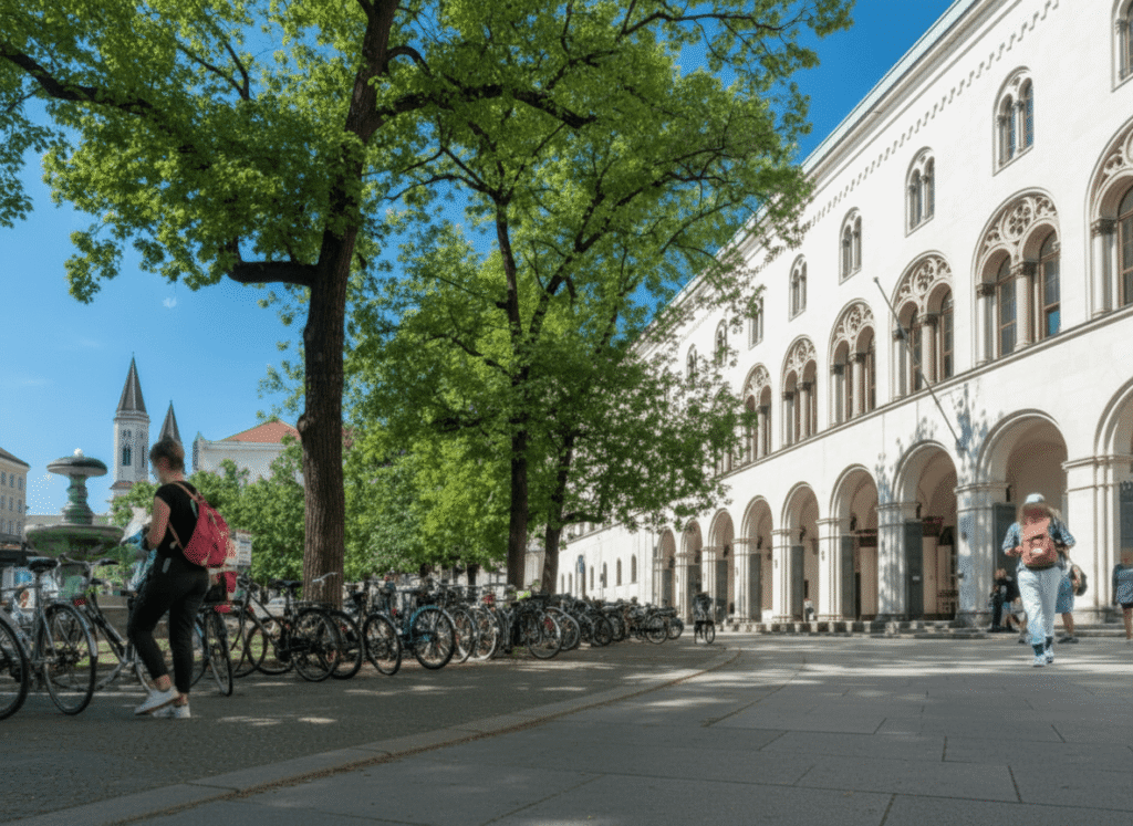 The campus is spread across central Munich, featuring historic buildings, modern research centers, libraries, and collaboration hubs.